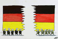Karikatur zur deutschen Einheit, Antonio Maia, Portugal, 2. Oktober 1990, Federzeichnung Wächst zusammen, was zusammengehört?