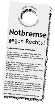 Angst lähmt. Niemand will sich selbst in Gefahr bringen. Dabei hat Zivilcourage nichts mit leichtsinnigem Kampfesmut zu tun. Wir Jusos wollen die Dresdnerinnen und Dresdner dazu ermuntern einzuschreiten. Es gibt viele gefahrlose Möglichkeiten um Opfern zu helfen. Einen Flyer mit Tipps zum richtigen Verhalten haben wir gleich am Tag darauf in den Dresdner Bussen und Bahnen verteilt. Wir werden diese Aktion noch oft wiederholen. Dresden braucht Zivilcourage!